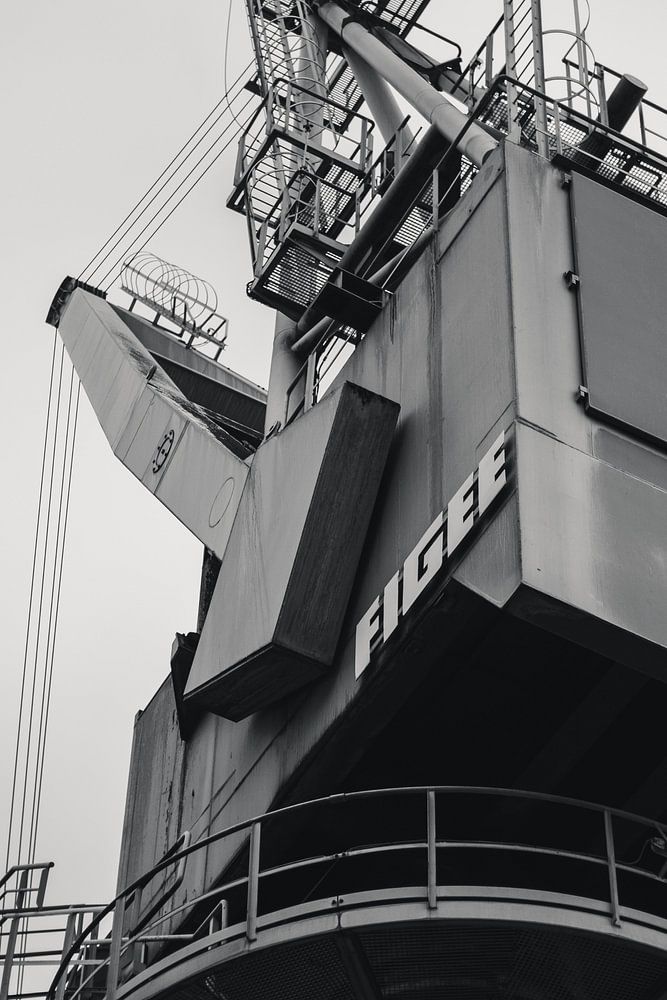 This powerful image shows the imposing industrial crane captured from a low perspective. The vertical lines of the metal structure and complex details of the crane create a visually dynamic effect, while the contrasting light and shadow highlights the raw beauty of the industry. The crane stands as a symbol of technological progress and power, but the black-and-white photography gives it a timeless, almost iconic look.