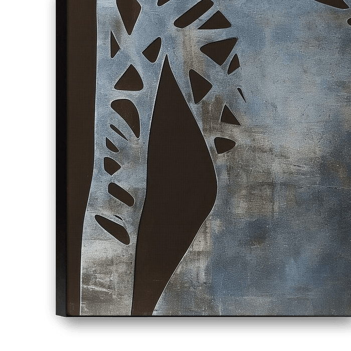 Industrial Woman - This women's painting shows an elegant, industrial-looking female figure with an abstract pattern of cut-outs, whose presence is enhanced by her contrasting blue and rust brown tones on a dark background.