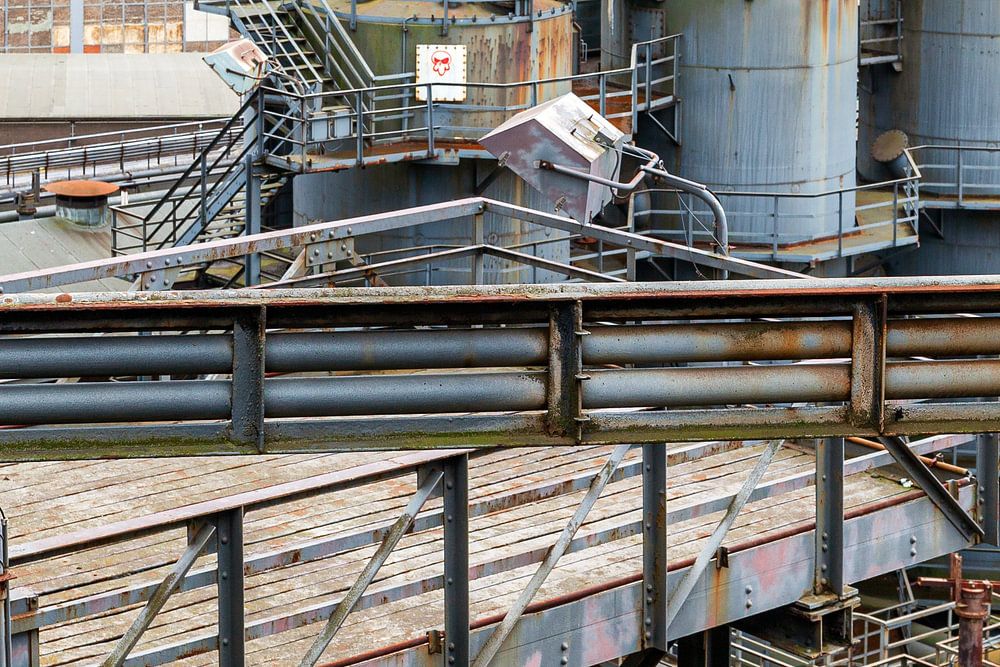 View of a tangle of pipes, cabling and technical installations from blast furnace number five of the former ThyssenKrupp blast furnaces, now the Duisburg-Nord Landscape Park, located in the heart of the Ruhr region, near Duisburg Ruhrpott. This photo was taken in spring 2019.