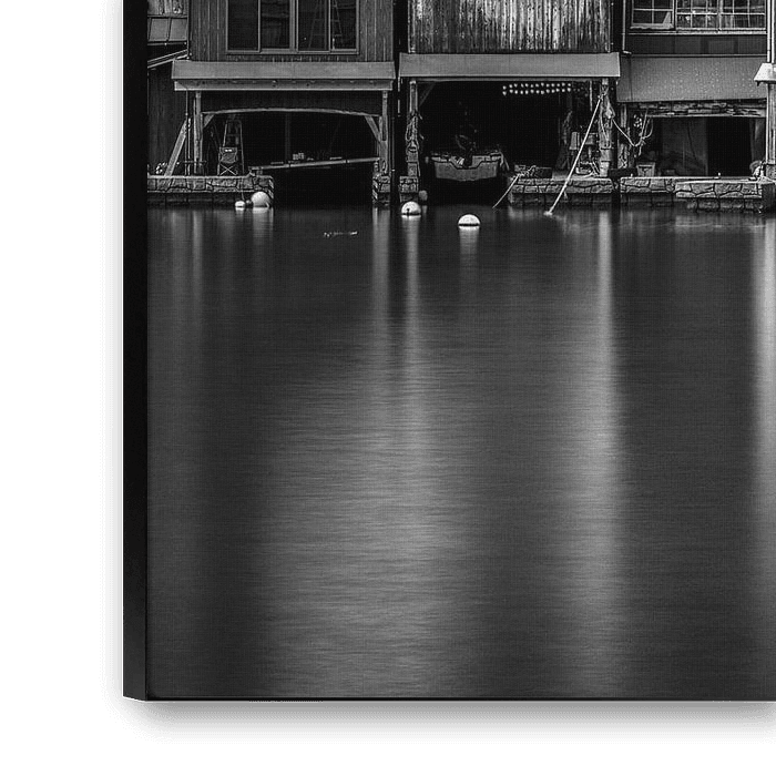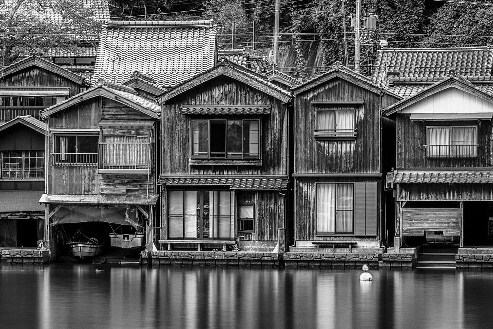 This black-and-white photograph captures the unique atmosphere of Ine, a fishing village on the coast of Kyoto Prefecture known for its funaya, traditional boathouses built directly on the water. The wooden facades, aged by the years, form an almost rhythmic line along the still surface of the water. Thanks to the long shutter speed,…