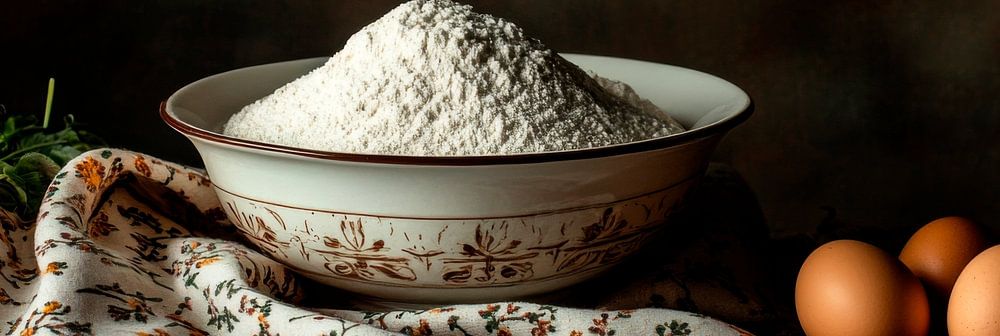 A harmonious arrangement of fresh ingredients unfolds on rustic wood: fine flour, glowing eggs and a jar of golden-brown yeast. The soft earthy tones create an inviting atmosphere. Ideal for the kitchen, it inspires baking and conveys a feeling of warmth and cosiness. A real eye-catcher for anyone who loves the art of cooking!