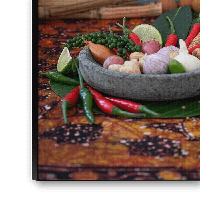 The picture shows a cobek with red and green rawits accompanied by fresh green limes, fresh coriander, turmeric, garlic, shallots and salam leaves, among others. This picture invites you to bring the delicious flavours of Indonesia into your own home. Beneath the cobek is an authentic Indonesian batik with Bali's Taman Ujung Water Palace in the background.