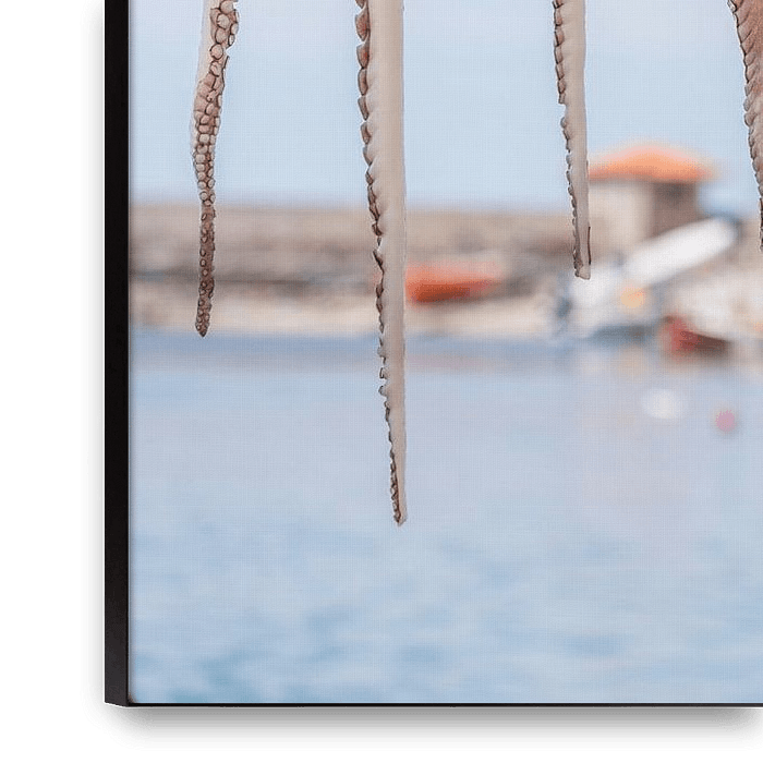 Karakteristirek voor de Griekse havenplaatsjes, het te drogen hangen van inktvisarmen. Vlak nadat ze gevangen zijn. Hier in de haven van Molivos op het eiland Lesbos. Lekkere vakantiesfeer.