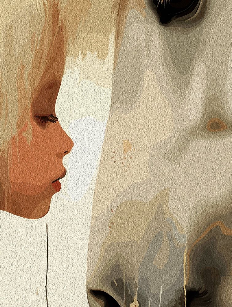 A tender, dreamlike digital painting capturing the pure connection between a young child and a gentle white horse. Bathed in soft ivory tones and minimal textures, this artwork evokes emotions of love, innocence, and trust. Perfect for nurseries, children's rooms, equestrian homes, or any serene space in need of warmth and calm. The subtle abstract strokes and angelic lighting give it a fine art aesthetic suitable for both rustic and modern interiors. A poetic gift for horse lovers, parents, or anyone touched by the innocence of animals and children. Available as canvas prints, framed artwork, acrylic panels, and more on all major wall art platforms.