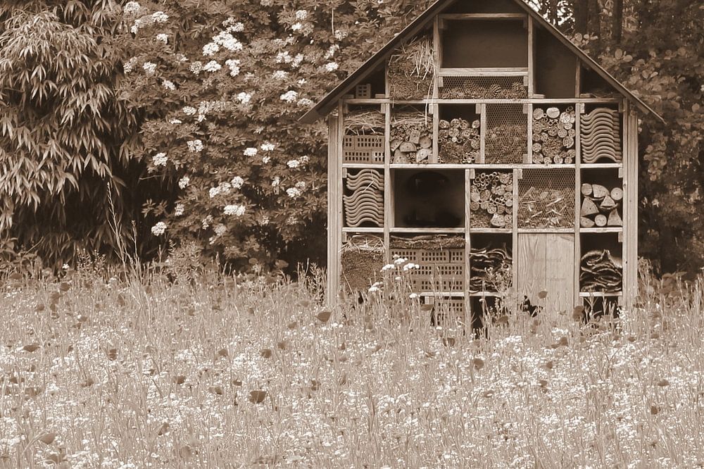 A specially constructed insect shelter often serves both an ecological and an environmental education purpose. Insect hotels constructed with different materials are often found in botanical gardens, ecological gardens and environmental education centers. Insect hotels are usually aimed at allowing insects to hibernate. Ladybugs and butterflies in particular make use of these, along with solitary bees and solitary wasps.
