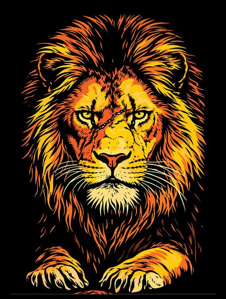 Pop art glow of an intense scarred beast, highlighting the textured mane in warm oranges and yellows with a piercing gaze and claw details, evoking raw power on a dark canvas, ideal for collectors seeking motivational wildlife digital pieces.