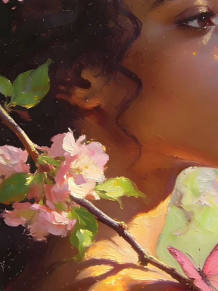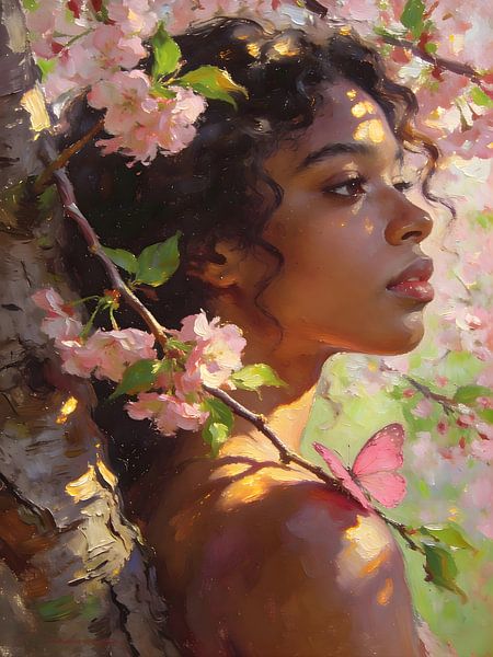 A young woman leans against the trunk of a blossoming tree as soft light filters through the blossoms. The pink flowers and branches frame her profile, whilst a butterfly rests on her shoulder and petals flutter past her.
