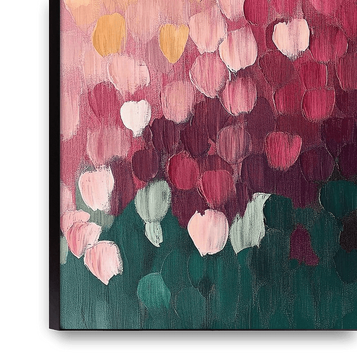 An abstract painting in a fascinating palette of emerald green, pink, burgundy and gold. The composition is a playful dance of shapes resembling leaves, but without clear contours, with the colours flowing together. From above, the colours begin light and bright, with the emerald green gently filling the space. Downwards, the shades…