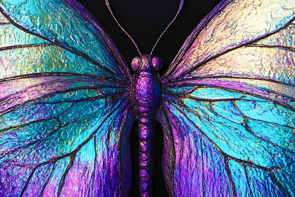 This striking iridescent butterfly catches the eye immediately with a stunning array of colours. The design shows delicate, detailed wings sparkling in shades of purple, blue and green, with a hint of golden sheen. The unique colour combination and surreal, abstract effect make this butterfly a real eye-catcher. This artwork would look great in a modern bedroom or a stylish office space, where it can act as an inspirational and calming element. Whether a lover of colourful art or a sophisticated addition to an interior, this design adds a touch of nature and magic to any space.