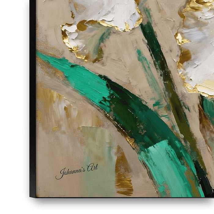 This artwork captures a close-up oil painting of a white iris in full bloom, celebrating its refined beauty through a lens of elegance and organic luxury. The ruffled petals unfold gracefully, their soft white surfaces delicately edged in gold, creating a subtle shimmer that enhances the flower’s sculptural presence. Gentle, diffused…