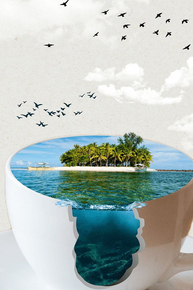 Inside the cup is a tropich island where you can also see the bottom of the ocean through the side.
