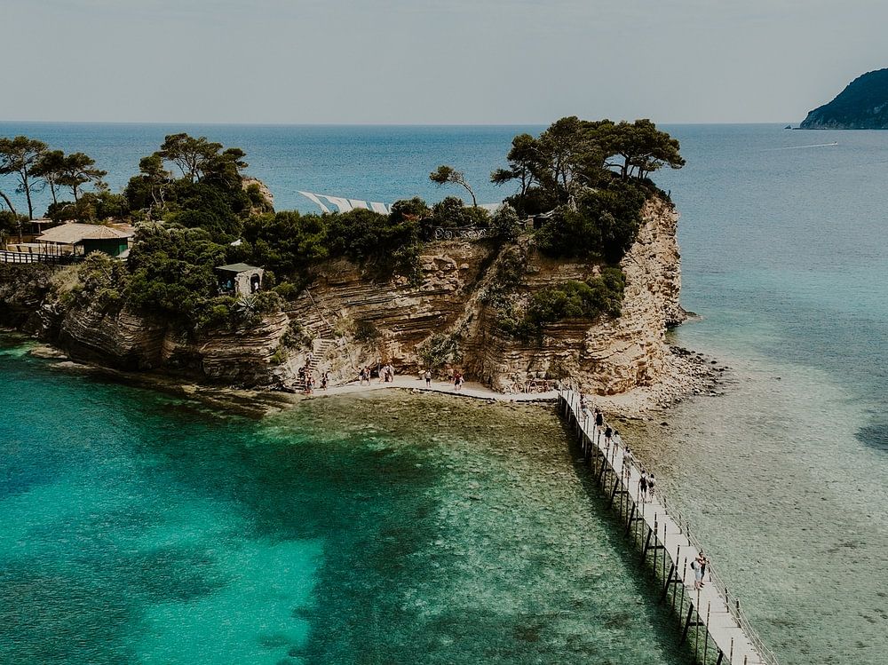 From the air, an almost surreal scene unfolds: the charming island of Cameo, connected to the Zakynthos mainland by a wooden walkway, floating above crystal-clear turquoise waters. What makes this place so special are not only the steep cliffs and pine trees that cling to the island, but also the large, flapping canvases that dance like graceful flags in the sea breeze - an enchanting detail that you only really see when you look closely.