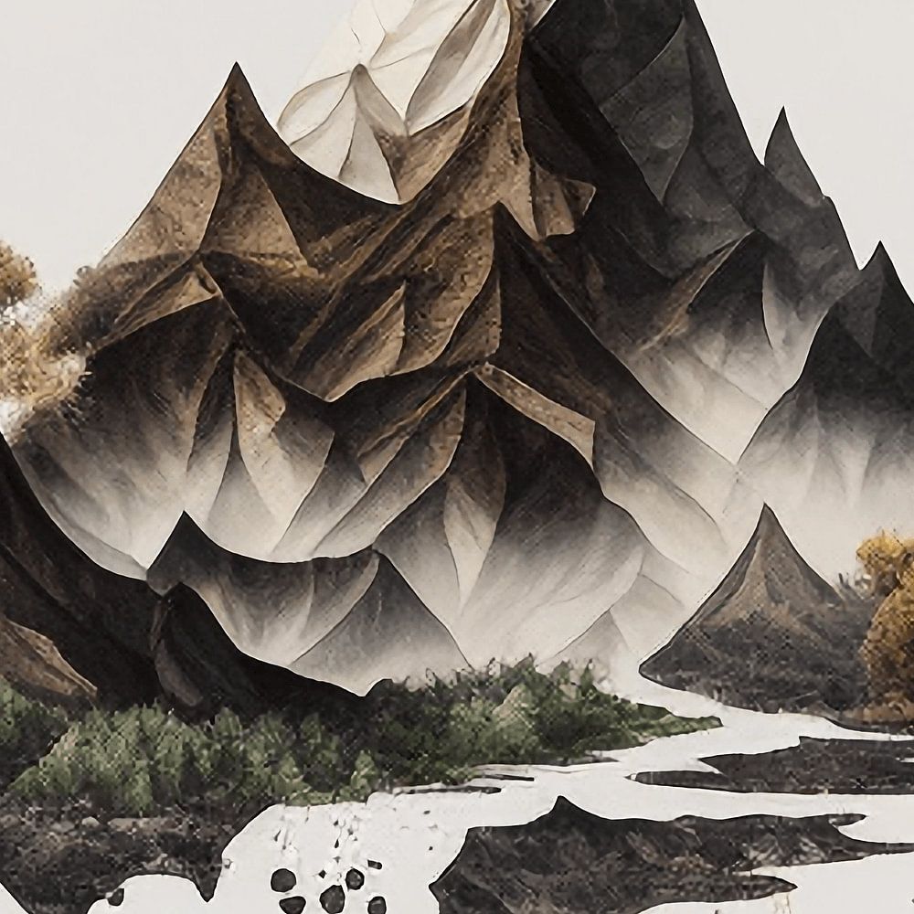 This artistic image shows a stylised mountain landscape with sharp, angular peaks rising from a rugged terrain. The upper part of the mountain is covered in snow and contrasts with the earthy, dark tones of the lower slopes. Trees, including golden-coloured ones, frame the foot of the mountain and convey a sense of depth and grandeur. The misty layers between the mountain ranges create a dreamy, atmospheric mood. In the foreground, a river meanders through the landscape, adding a touch of movement to the otherwise tranquil scene. Small abstract elements, such as black dots, reinforce the surreal and modern aesthetic of the composition.