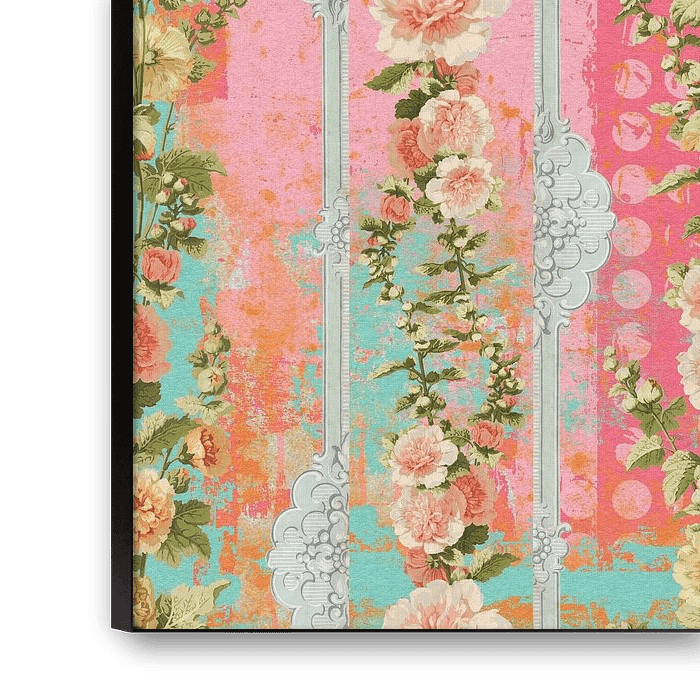 Bring a touch of nostalgic charm to your home with this Victorian-era inspired wallpaper. This pattern combines lush, ascending flower stems of hollyhocks (Hollyhocks) with a striking and colourful background, making a powerful yet elegant statement.