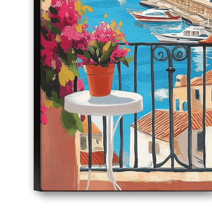 A picturesque Mediterranean scene shows a sun-drenched coastal town, where a balcony overlooks an azure bay with white sailboats. The traditional architecture with terracotta roofs and light-colored houses is framed by lush pink bougainvillea. In the foreground is a small round table with a flower pot, while a figure in a red and white striped dress and summer hat enjoys the breathtaking view.