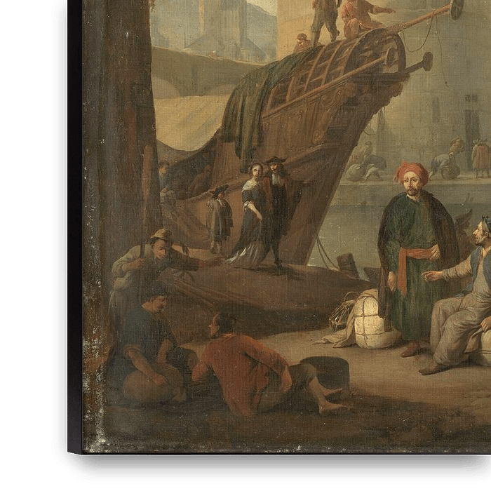 Italian harbour with fortified tower, Johannes Lingelbach On the quay, a group of resting workmen. On the left, an elegant couple at the prow of a ship. In the foreground two little dogs.