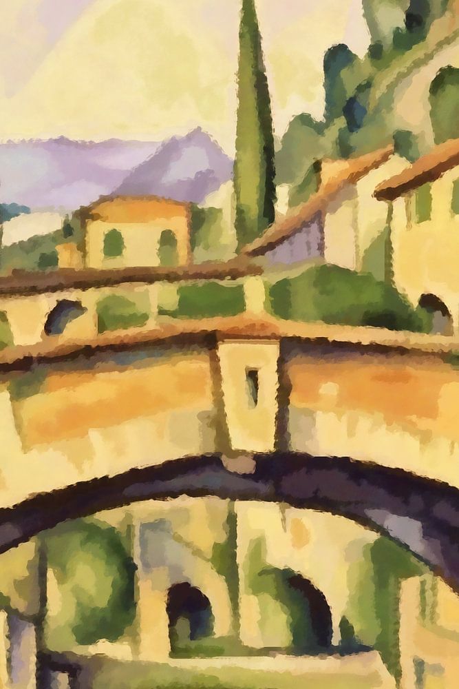 Italian village by river with old stone bridge was created digitally. It is an impression of a hot summer day at the time of day when the sun is highest in the sky. Design: portrait. Colour scheme: soft yellow, lilac, purple, green and orange. Impressionistic: painted quickly with a realistic rendering of visible reality.