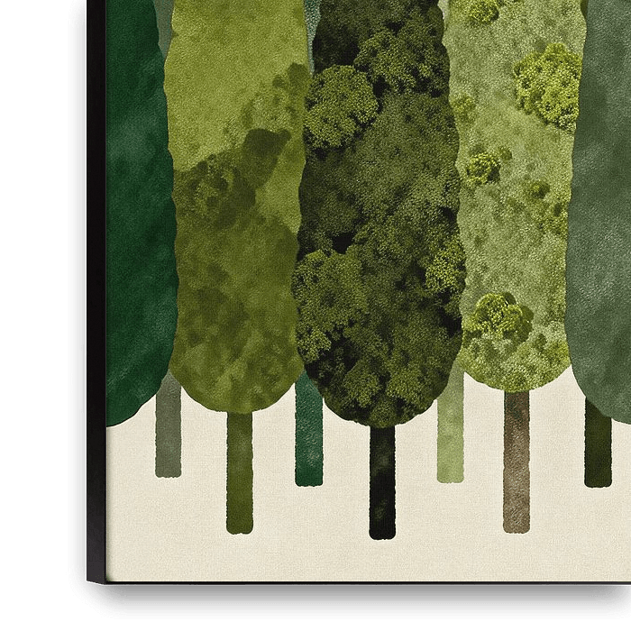 Bring the calming essence of an evergreen forest into your home with this stunning JAPANDI-style botanical print. This artwork features a rhythmic row of slender cypress trees, rendered in a beautiful spectrum of greens—from soft sage and moss to rich emerald and deep forest tones.