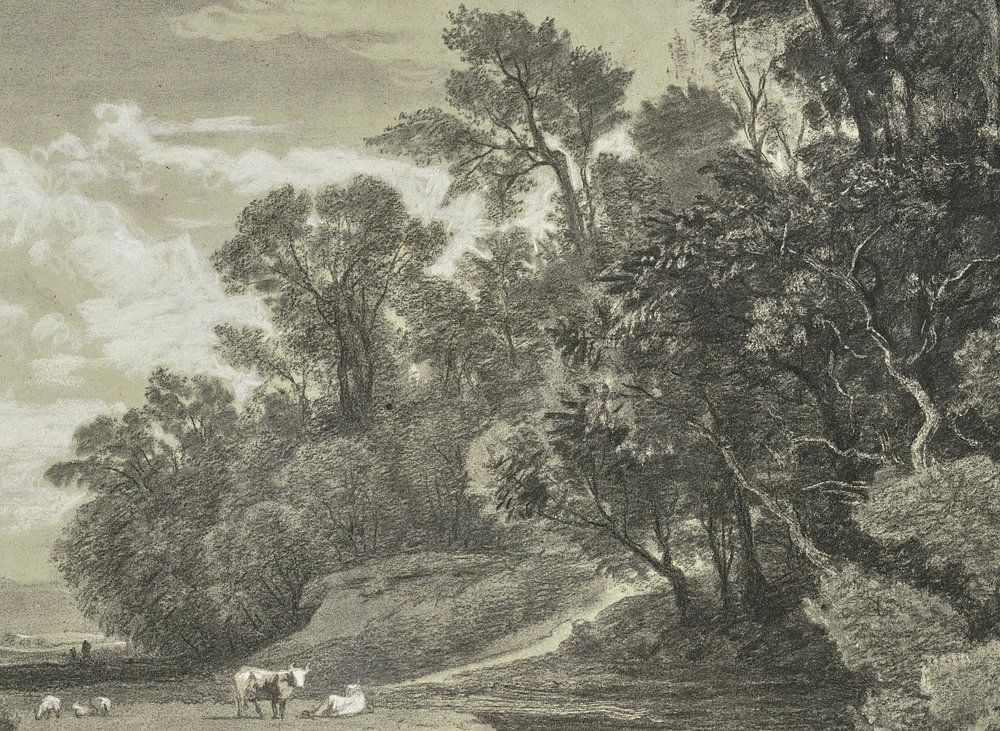This print shows a landscape with a river with cattle, cattle or cows in a field among the trees. On a hill, a man is resting.