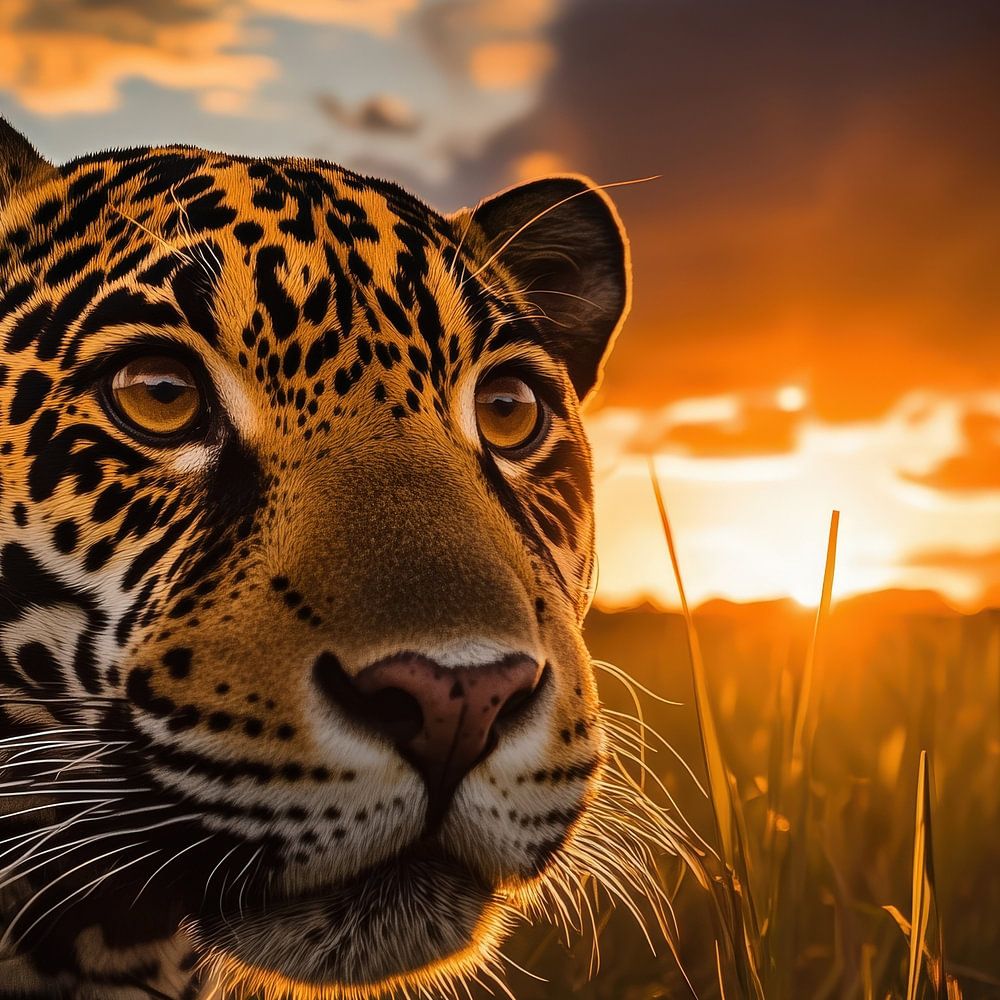 This evocative close-up shot captures a majestic jaguar lying gracefully in a field as the sun sets, creating a breathtaking scene of natural beauty. The jaguar, with its powerful yet elegant form, is depicted in exquisite detail, its golden coat adorned with bold, black rosettes that stand out against the warm tones of the sunset. The jaguar’s eyes, sharp and intense, reflect the fading light, adding a sense of depth and mystery to its gaze.