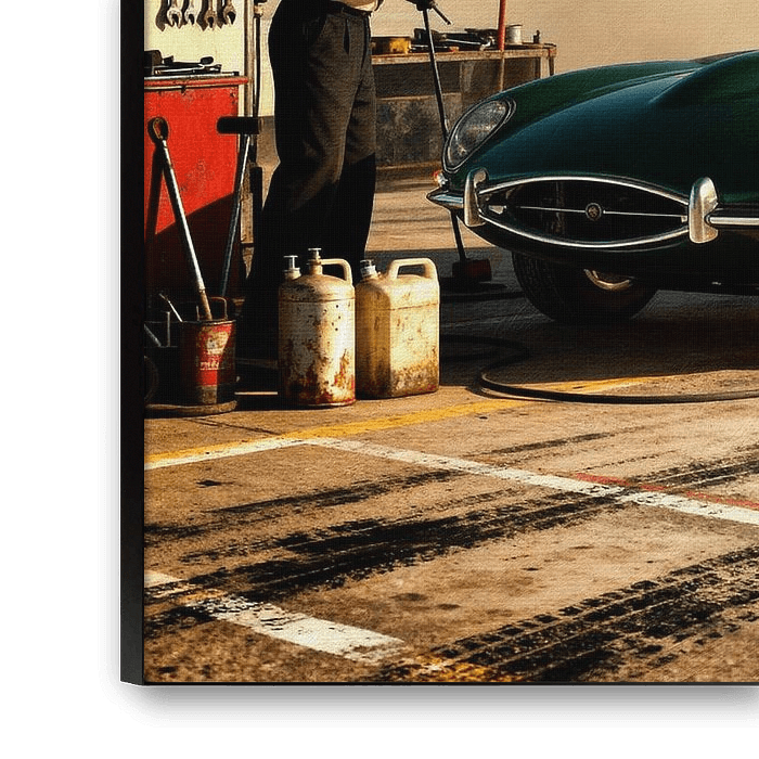 Every detail, from the tire marks on the ground to the weathered jerry cans, was chosen to transport the viewer to a 1960s pit stop—a moment frozen in time. This painting is not just about a car; it’s a celebration of the artistry, passion, and human connection that define the world of classic racing.