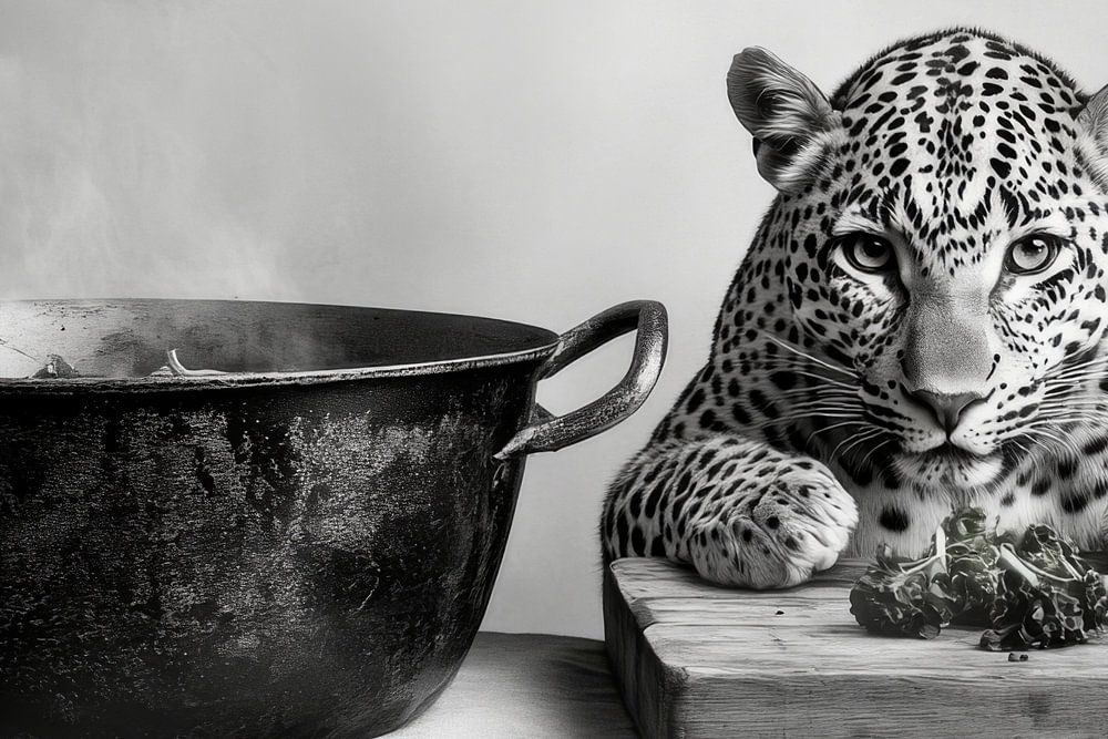 A fascinating composition of strength and homeliness: a majestic leopard rests serenely next to a steaming saucepan. The contrasts between the wildness of the animal and the warmth of the kitchen create an exciting tension. Perfect for a kitchen where culinary delights meet a thirst for adventure and inspire conversation.