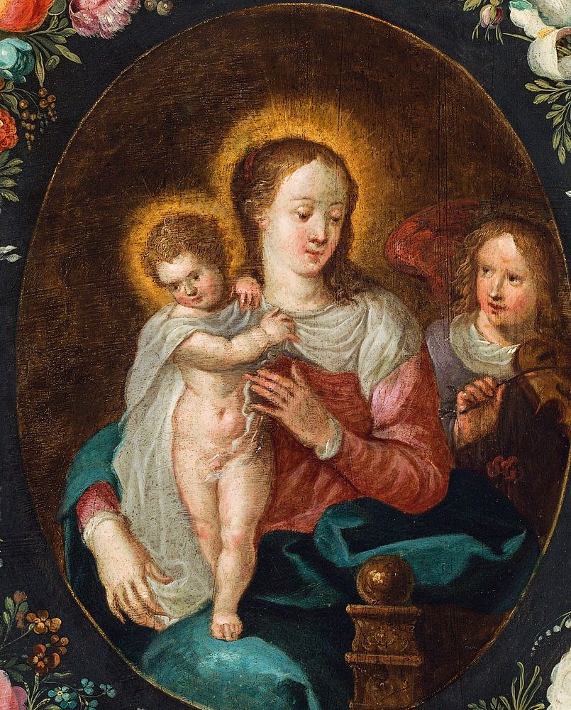 Jesus Christ sits as a child with mother Mary in a wreath of flowers. A Christian image in a still life.
