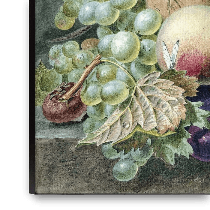 Painting with edible nuts, peach, grapes, berries, raspberries and a pear, but also animals like a butterfly.