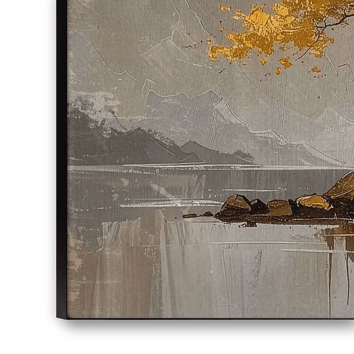 The atmosphere is simultaneously mystical and powerful. The painting depicts an ancient, jagged tree with brilliant golden leaves, providing a strong contrast to the dark, grey-brown mountains and shimmering water. This creates a sense of nature's determination and resilience.