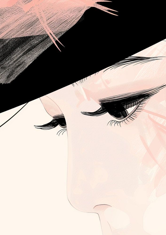 Subtle portrait of a woman with Japanese influences. Peach colour. Less is more. Peach Fuzz. Black and pink lines against a light background, mostly transparent. Matching various styles and trends. Transparent. Artist: Bianca ter Riet