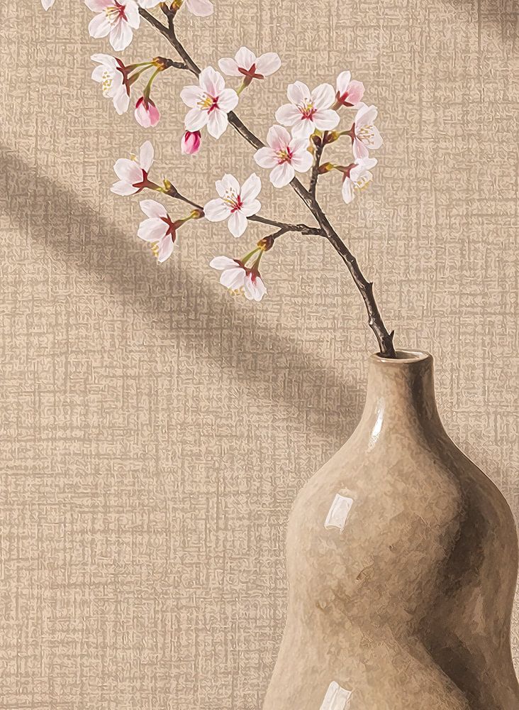 An ode to the serenity of the moment. 'Silent Bloom' captures the refined balance between nature and simplicity a single blossom branch, softly lit, resting in an organically shaped vase. The neutral tones and subtle textures exude the essence of Japandi style: serenity, harmony and timeless beauty.
