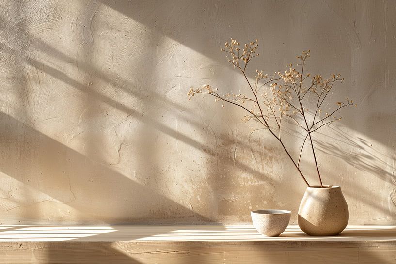 This work is a hushed still life in Japandi style, focusing on simplicity, light and material. The composition is deliberately kept sober: a ceramic vase with delicate, almost transparent sprigs and a small bowl, placed on a wooden surface. The objects are given space to exist without the image becoming crowded. The background is calm…