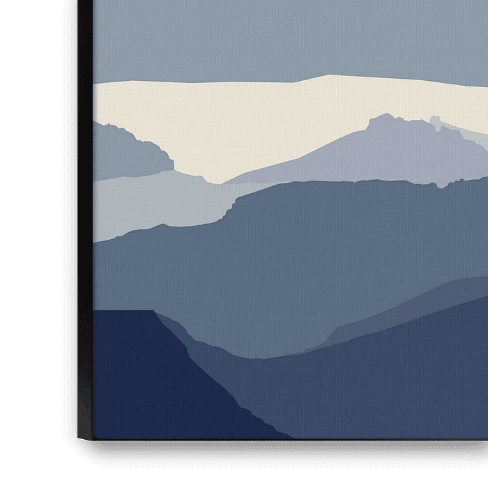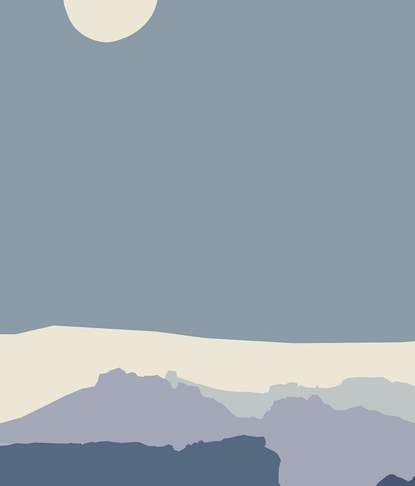 Delicate landscape painting with mountains and moon in black, white, blue-grey, blue, grey and ivory .