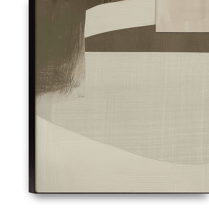 This abstract artwork is characterised by a harmonious composition of soft earth tones, organic shapes and layered textures. The use of subtle textures and transparent areas creates a sense of depth and tranquillity, whilst the bold shapes lend it a modern and timeless character.