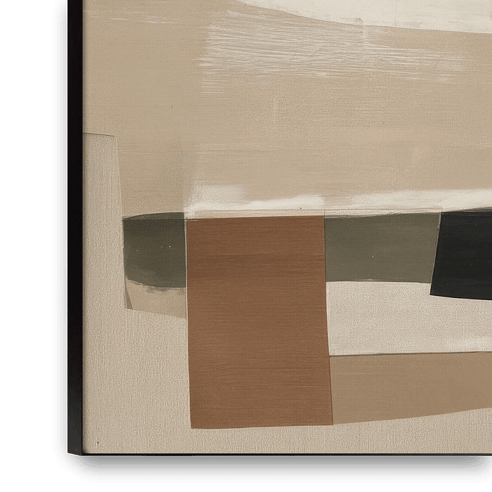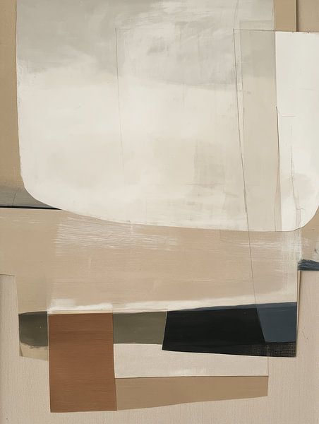 This abstract artwork is characterised by a harmonious composition of soft earth tones, organic shapes and layered textures. The use of subtle textures and transparent areas creates a sense of depth and tranquillity, whilst the bold shapes lend it a modern and timeless character.
