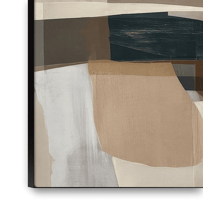 This abstract artwork is characterised by a harmonious composition of soft earth tones, organic shapes and layered textures. The use of subtle textures and transparent areas creates a sense of depth and tranquillity, whilst the bold shapes lend it a modern and timeless character.