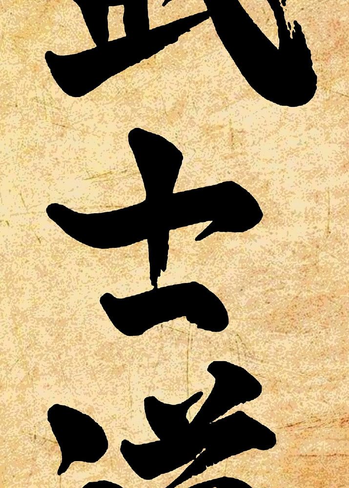 The image showcases three Japanese kanji characters written in bold black ink on a textured, aged parchment background. The characters are arranged vertically, with the top character being the largest and the bottom character being the smallest. The background is a warm, earthy brown with subtle hints of orange and red, giving the image a vintage and traditional feel