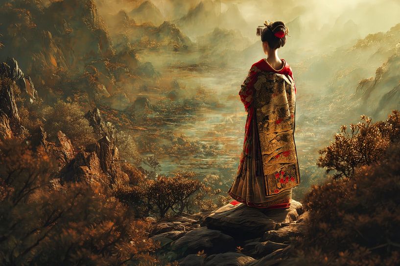 picturesque Japanese art featuring a fictional geisha gazing out over a beautiful landscape