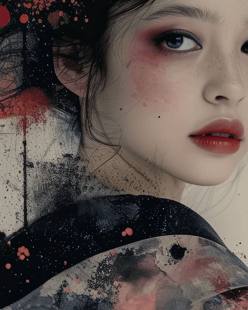 Buy this portrait Japanese Geisha in collage style by Carla Van Iersel on canvas, ArtFrame, poster and wallpaper, printed on demand in high quality.