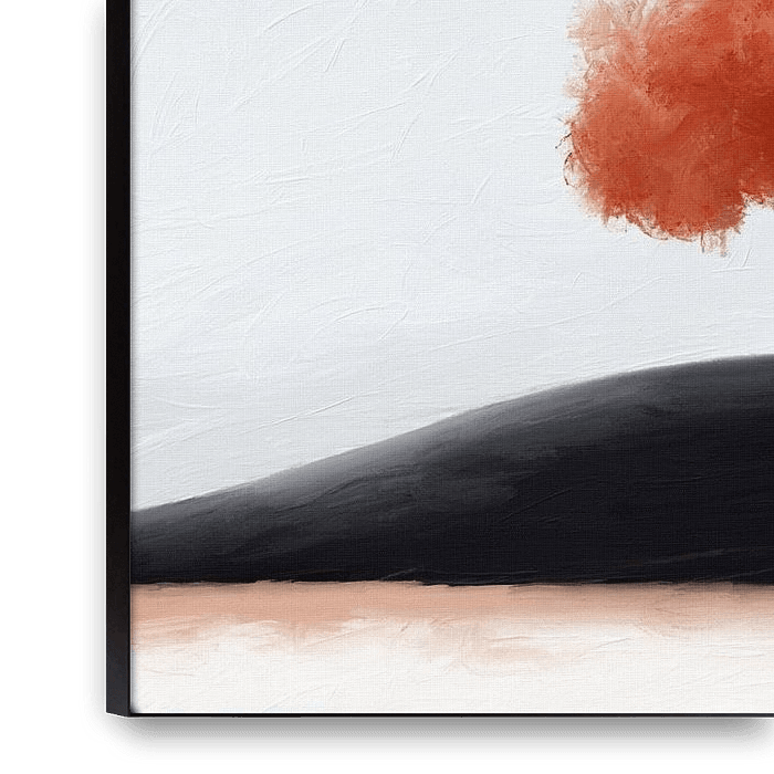A solitary tree with vibrant red foliage stands atop a gently sloping hill, set against a soft, muted sky. The stark contrast between the tree and the surrounding landscape evokes a sense of tranquility and simplicity.