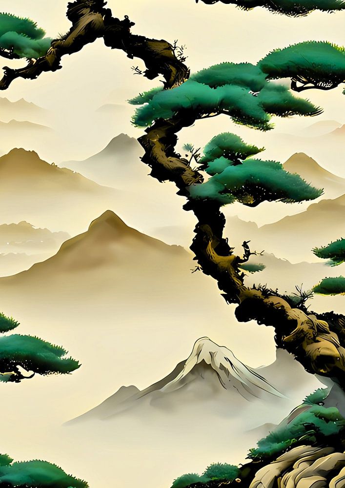 The image depicts a serene and mystical Japanese mountain landscape. A large, gnarled pine tree stands tall against a backdrop of rolling hills and misty peaks, with a large, pale moon visible in the upper right corner. The scene is painted in soft, muted tones of green, brown, and white, creating a sense of tranquility and peace.