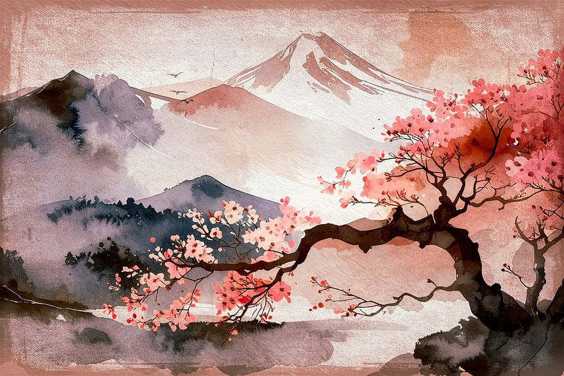 Buy this painting Japanese Spring Landscape: Mount Fuji and Flowering Sakura by Studio Pieternel as a reproduction on canvas, ArtFrame, poster and wallpaper, printed on demand in high quality.