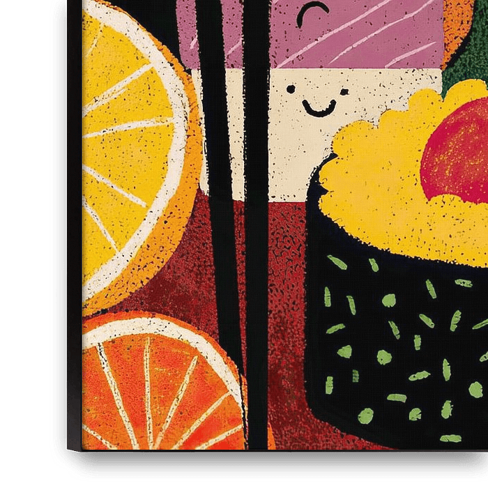 This painted illustration depicts a cheerful collection of sushi. The various sushi rolls, nigiri and toppings are placed close together and fill the entire image. Citrus slices, rice, nori and salmon alternate. The style is clearly inspired by kawaii culture from Japan. The Kawaii style is much more than just a look; it is an entire…