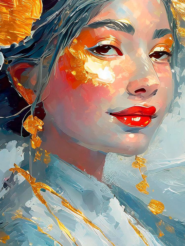 This digital artwork (technique palette knife) is a portrait of an elegant Japanese woman dressed in soft silk with gold accents and flowers of gold in her hair.
