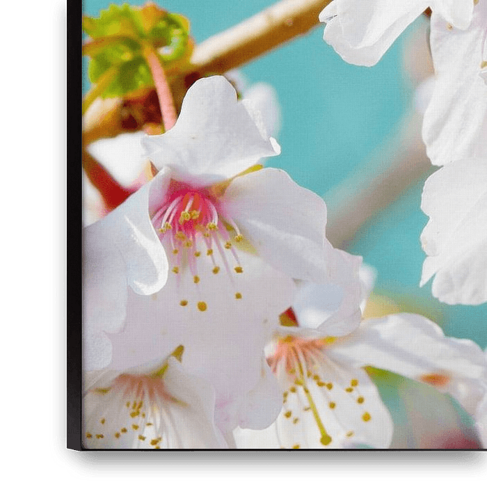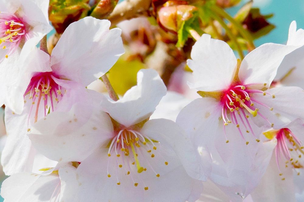 This macro shot of the blossoms of a Japanese ornamental cherry captures their refined beauty and elegance. The white petals with a subtle magenta heart contrast beautifully with the bright blue background, creating a light, serene and poetic atmosphere.