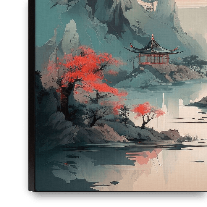 Buy this landscape artwork Japanese pagoda by the river under a red sky by Erika Kaisersot on canvas, ArtFrame, poster and wallpaper, printed on demand in high quality.
