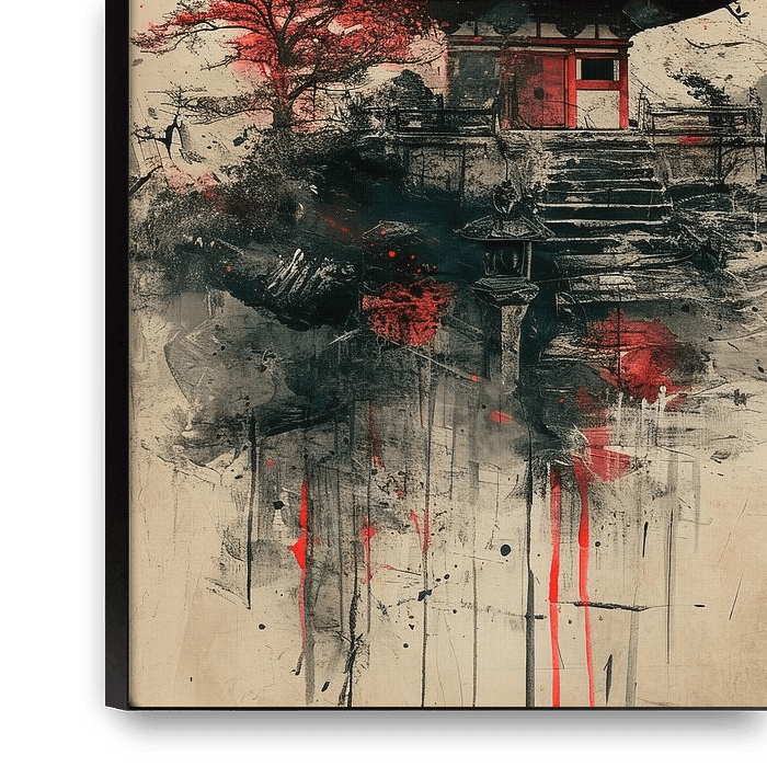 Drawing of a Japanese pagoda in ink with red and black in Sumi-e style.