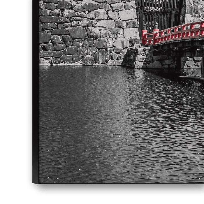 This picture was taken during the Japanese cherry blossom season on the island of Honshu and shows a classic Japanese palace building, which can be reached via a wooden bridge with red railings.