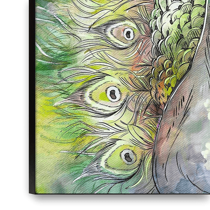 An expressionistic illustration of a Japanese peacock in soft natural colors against a gorgeous painted background with soft texture.