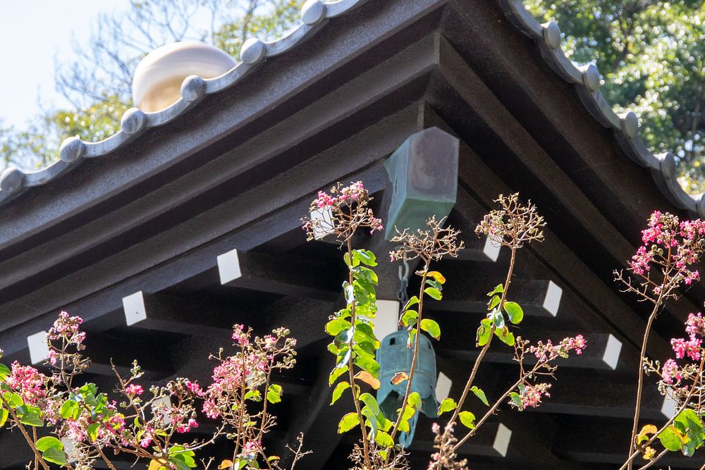 Detail of a part of a roof of a temple in Japan, with pink blossom on a bush in the foreground.